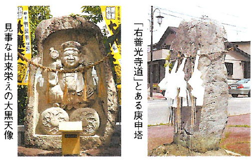 青年石工の髪の冴えちょっと寄り道して、道しるべの向かいにあ枝垂桜(大町市指定天然記念物のエドヒガン)の大樹の根方にある大黒天像を見よう。