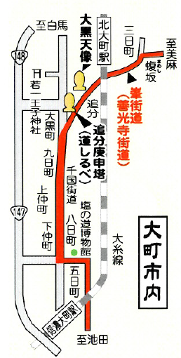 町川もあった大町宿大町宿は松本糸魚川間を結ぶ千国街道の要衝であった。南の池田町から大町市内に入ると、五日町、八日町、下仲町、上仲町、下仲町、 上仲町、九日起点・大町町、大黒町、 追分と北へつづく。